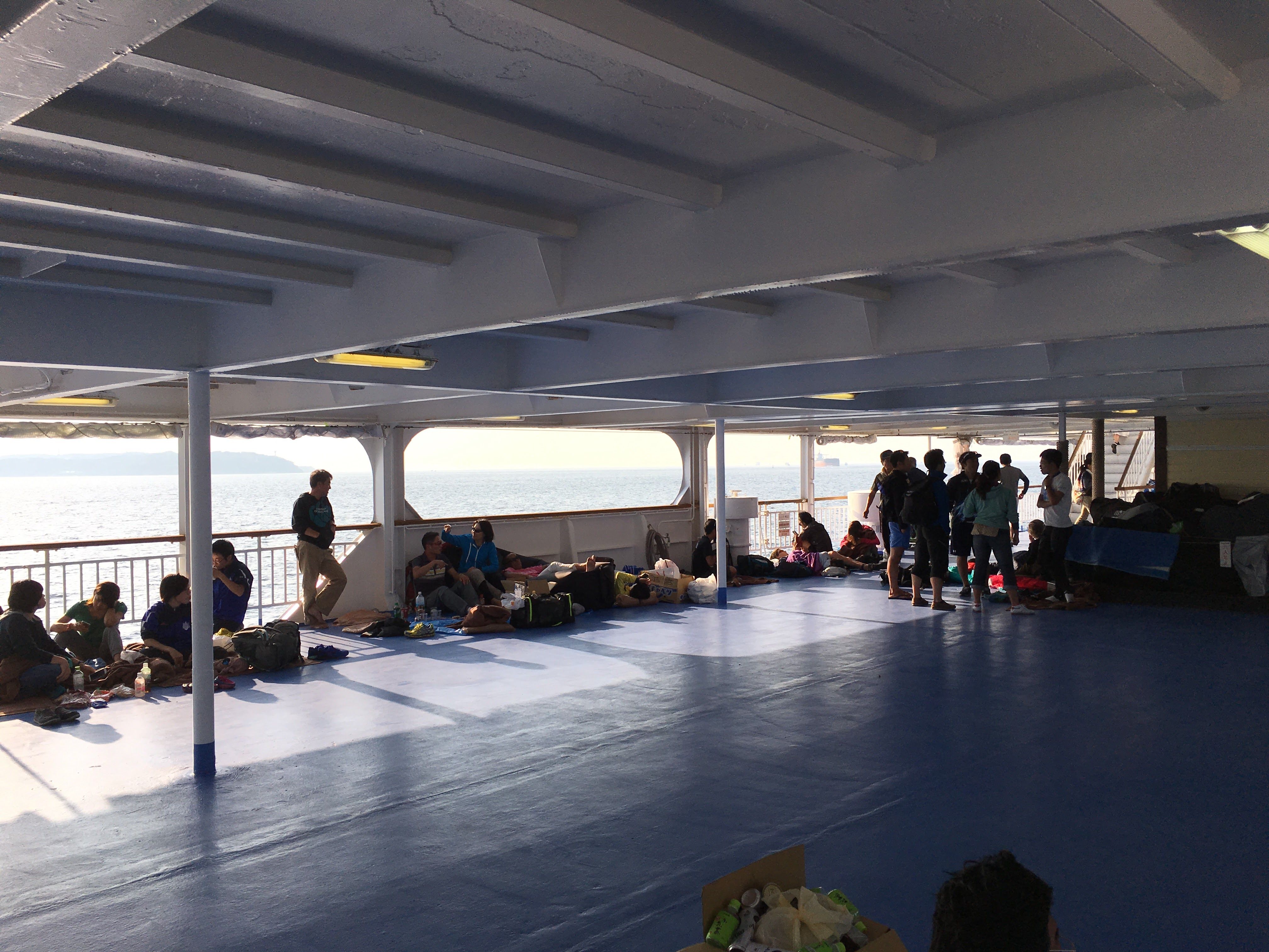 帰りはフェリーで、飲み会をしながら帰ります。フェリーの甲板でこんな感じであちこちで飲み会が展開されている状況です。6時間、ゆっくりではありましたが飲み続けました。疲れた。毎年、天気がいいレースです。